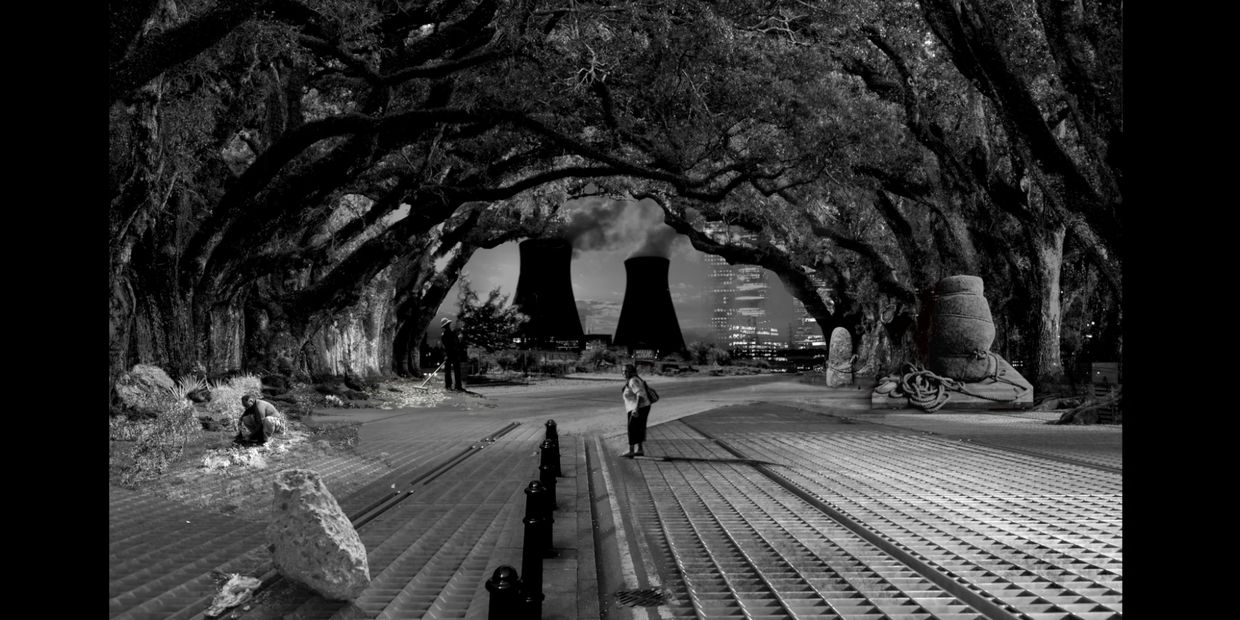 A woman stands in a surreal urban landscape. The floor is a metal grid, the industrial towers behind spew smoke, the scupltural forms around her might be by chance or be placed. She is on Drax highway a road leading to the home of the Drax dynasty who were able to generate extraordinary wealth through the cultivation of their sugar plantations in Barbados. The highway trees are the last of the canopy that then break into a high brick wall butted up tight to the road that seems to go on for ever.